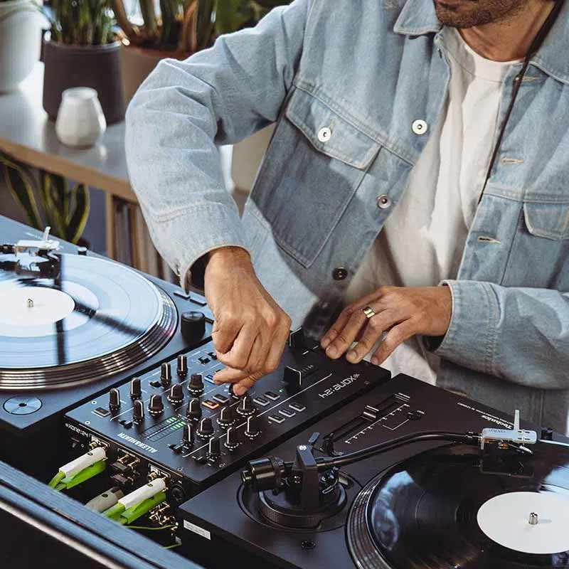 2 стереоканала (Phono/Line): Каждый канал имеет переключатель для работы с виниловыми проигрывателями (PHONO) или линейными источниками (LINE), что делает его идеальным для любого DJ-сета.