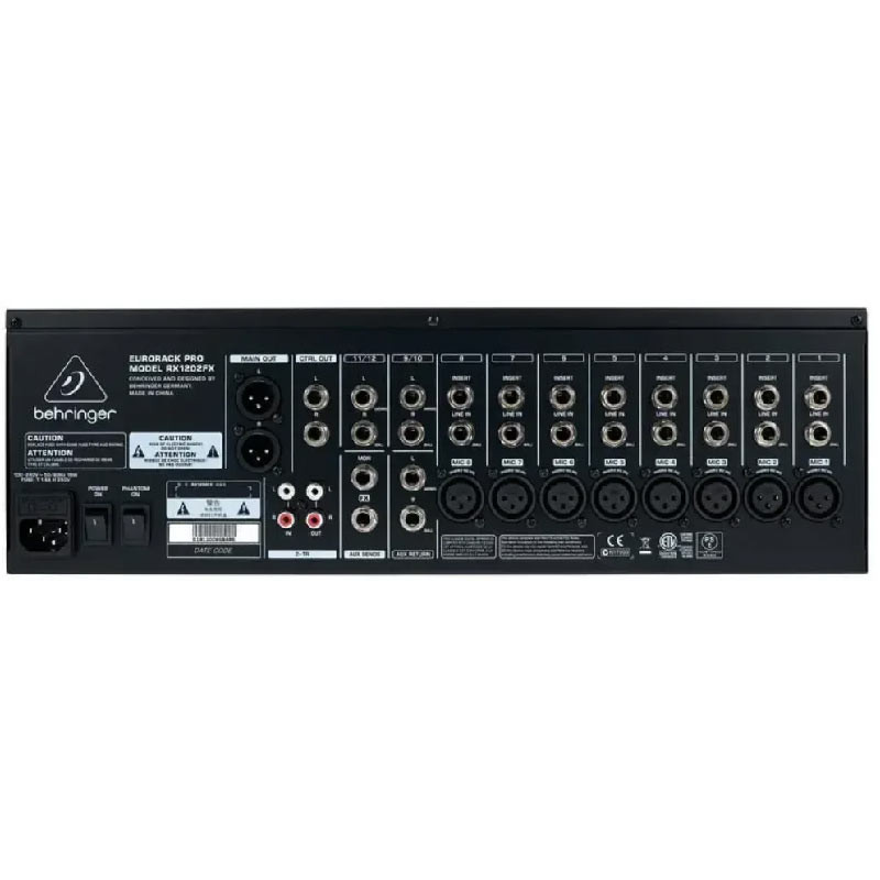 EuroRack PRO rx1202fx позволяет оперировать восемью монофоническими и двумя стереофоническими каналами. Входная секция находится на задней панели корпуса. Кроме основных разъемов, там находятся гнезда разрывов для моноканалов, к которым можно подключить компрессоры, предусилители и другое вспомогательное оборудование, восемь микрофонных входов, предусилители для которых уже встроены в EuroRack PRO rx1202fx, и вход 2-Track. Для подключения к микшеру конденсаторных микрофонов можно подать на входы фантомное питание 48V.