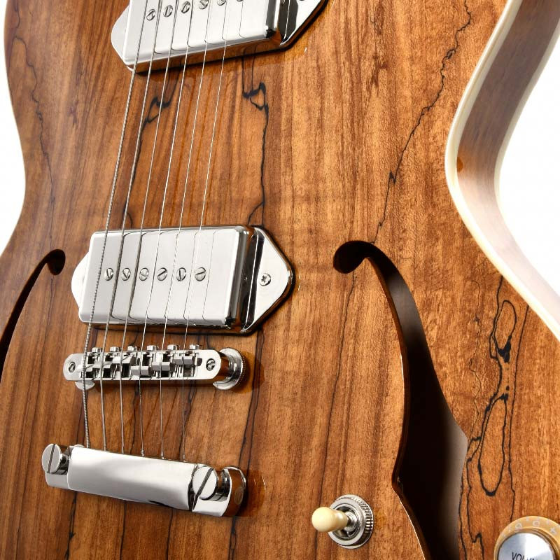 Звук формируется парой DogEar P90 с магнитами Alnico 5. Нековой звукосниматель (7.8k) звучит мягко и объемно, а бриджевый (9.4k) добавляет прорезную агрессию — идеальный баланс между винтажным тембром и современным присутствием. Классический набор регуляторов (2 громкости, 2 тона, 3-позиционный переключатель) позволяет тонко формировать звук под стиль исполнителя.