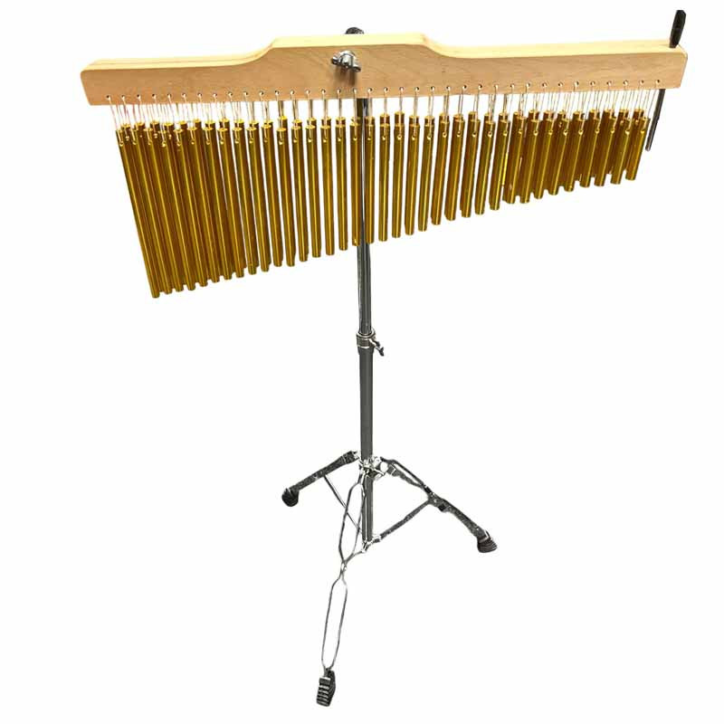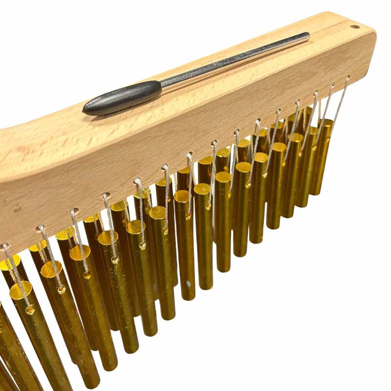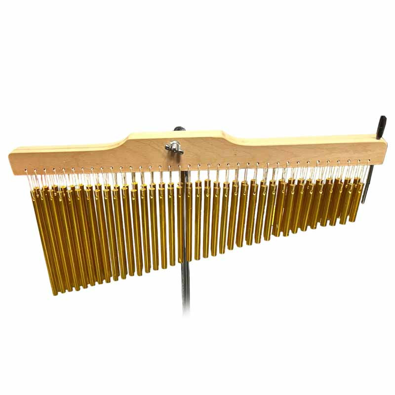 Корпус інструмента виготовлений із дерев’яної планки — натуральний матеріал надає йому природного звукового резонансу й приємного тактильного відчуття. На цю планку на нитках закріплені алюмінієві трубки, що виконують роль звучачих елементів, забезпечуючи рівне тональне звучання по всій довжині. Така конструкція демонструє баланс між акустичною теплістю і металевою чіткістю — саме те, що шукають професіонали.