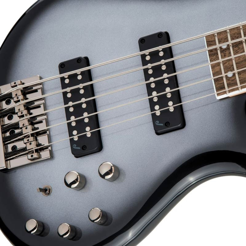 Jackson JS Series Spectra Bass JS3V (Silverburst) - 5-струнна бас-гітара з мензурою 35 дюймів, розроблена для максимального комфорту та універсальності звучання. Корпус виготовлений з тополі та має зміщений контур зі збільшеним верхнім рогом, що забезпечує рівномірний розподіл ваги інструменту та знижує ризик "клювання" грифа. Така конструкція гарантує ідеальний баланс та зручність при тривалій грі. Кленовий гриф з болтовим кріпленням та з'єднанням типу scarf доповнений накладкою з лаврового дерева із складовим радіусом 12–16 дюймів. На накладці розташовані 24 лади Jumbo та біла точкова інкрустація. Контур грифа Speed забезпечує високу швидкість та легкість виконання.