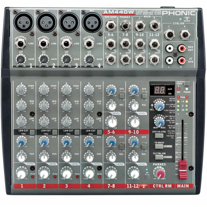 PHONIC AM 440 W - аналогова консоль змішування професійної серії AM з вбудованим процесором цифрових ефектів і вбудованим модулем Bluetooth. PHONIC AM 440 W має 12 каналів, 4 з них моно, які мають незалежні регулятори 3-смуговий еквалайзер і регулятори EFX і Pan.