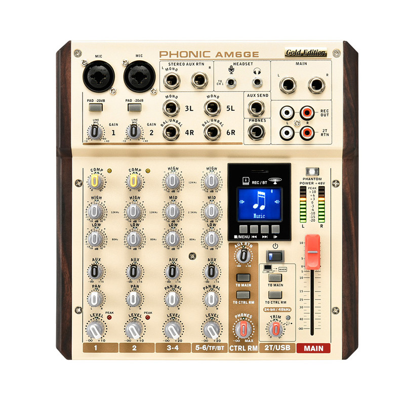 Phonic AM6GE - аналогова змішувальна консоль, Gold Edition, 6 каналів, 2 мікрофона preampa, 4 лінійних входи, Aux Send, Кімната управління, USB інтерфейс (24 біти, 48 кГц), компресор, Bluetooth, вхід карти пам'яті.