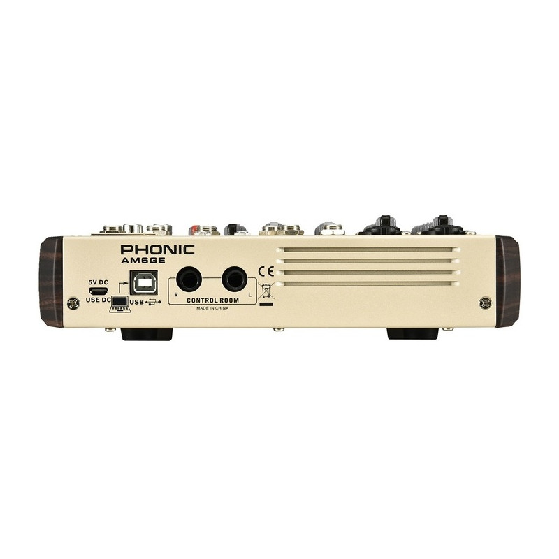 Наднизькі мікрофони забезпечують високоякісний звук для дизайнерських студій або додатків для підсилення звуку. Майстер-розділ пропонує подвійні світлодіодні ліхтарі рівня 10 сегментів і основний лівий / правий контролер підгоря. Змішувач також полегшує моніторинг суміші з EFX для управління та доступу до навушників високої гучності. Phonic AM6GE постачається з адаптером живлення та кабелем живлення USB-C.