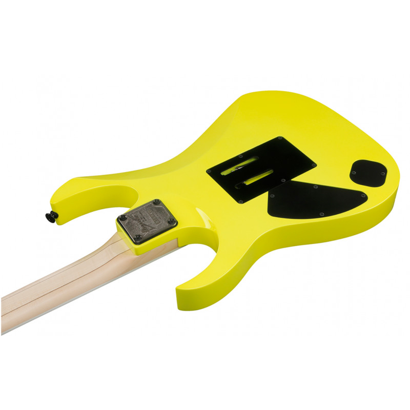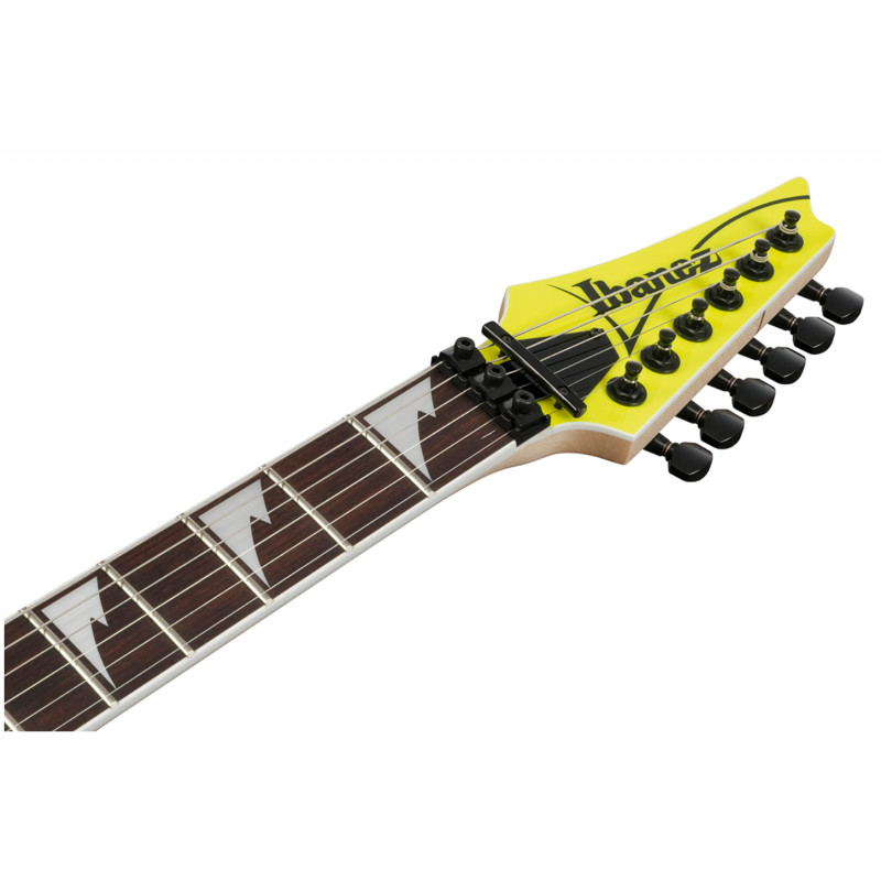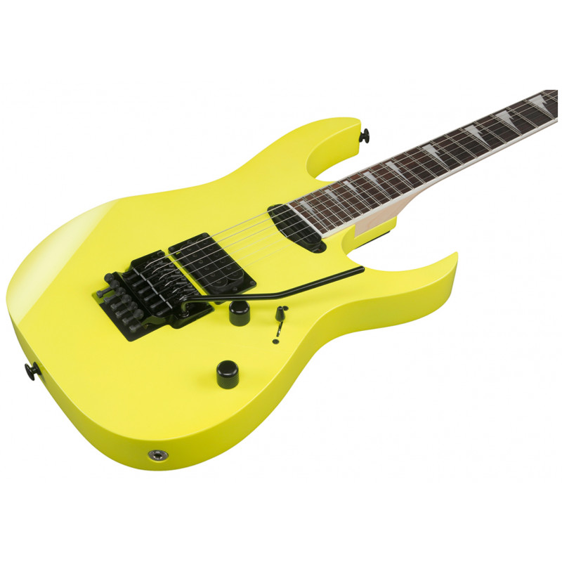 Ibanez RG565R DY – 6-струнна електрогітара, серія Genesis Collection, корпус – RG, матеріал корпусу – липа, гриф – 5-шарова конструкція з клена та горіха з накладкою палісандр, профіль – Super Wizard, лади 24 Jumbo, мензура 25.5", звукознімачі (H-H) – Ibanez Infinity R/V8, бридж Edge Tremolo, чорна фурнітура, колір – жовтий, вироблена в Японії.