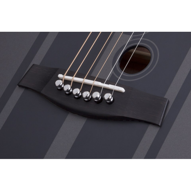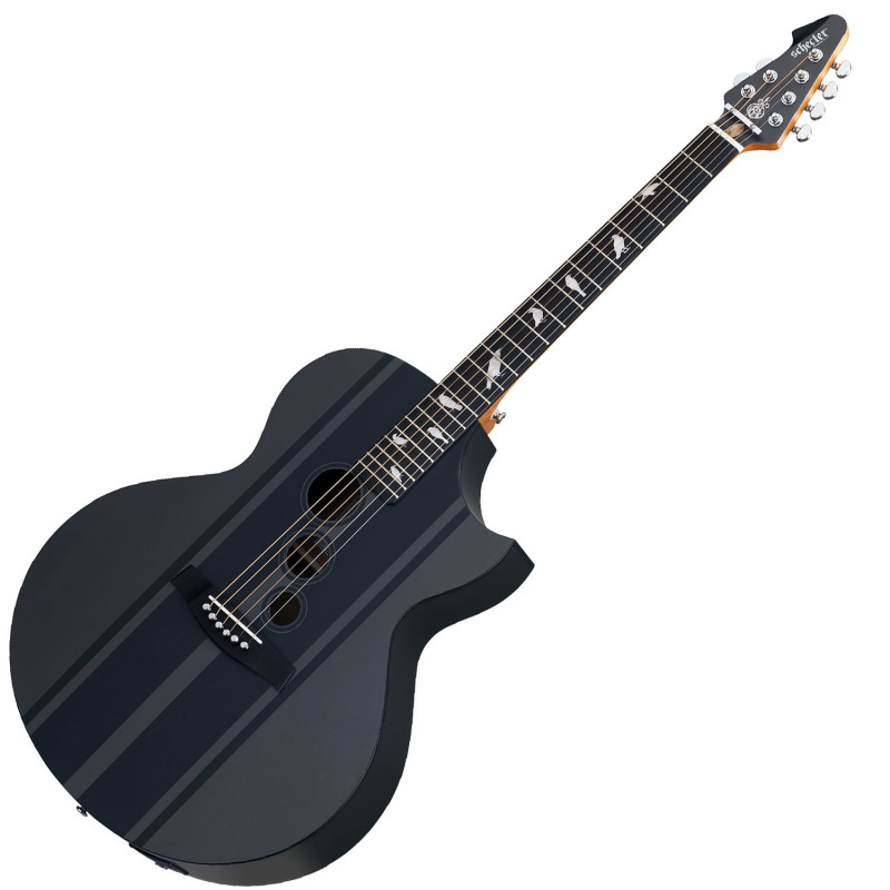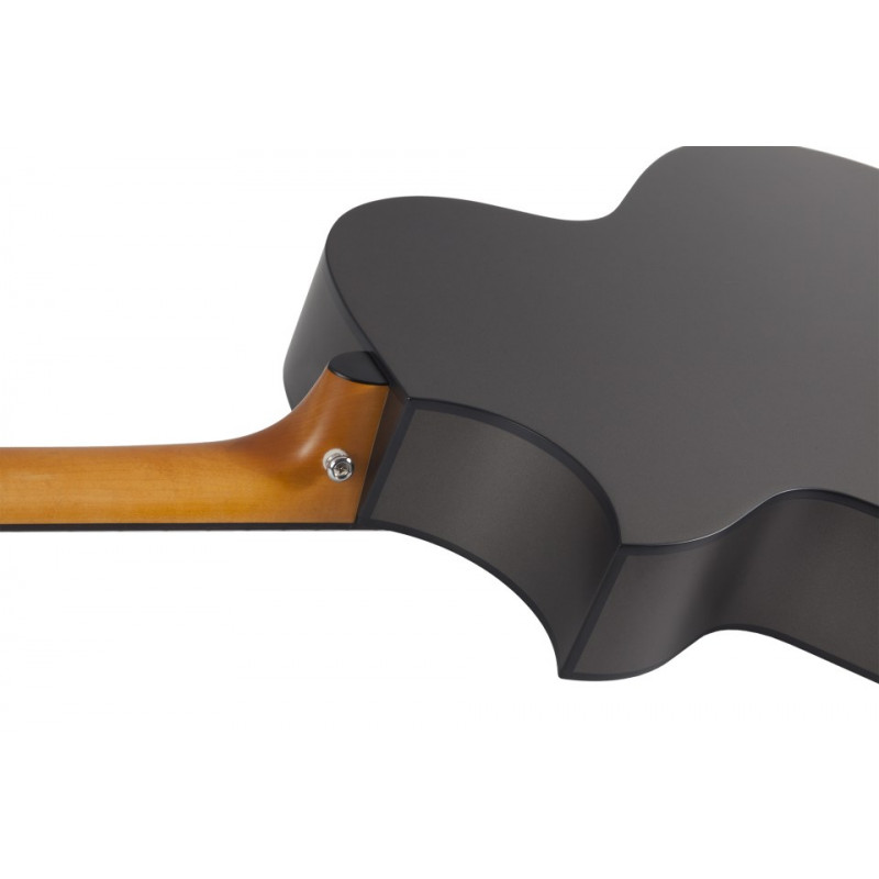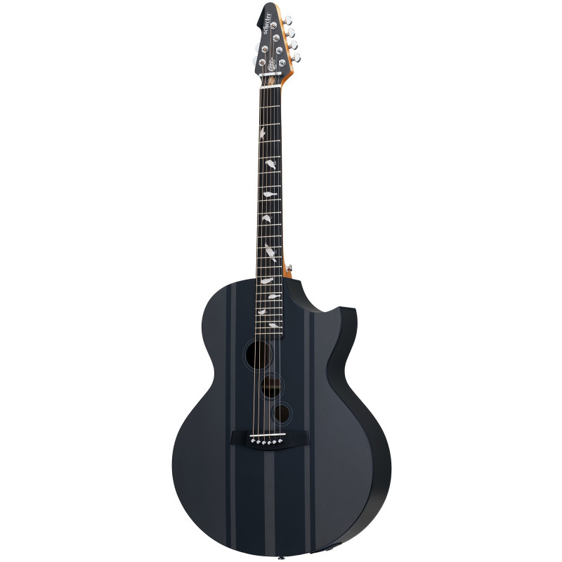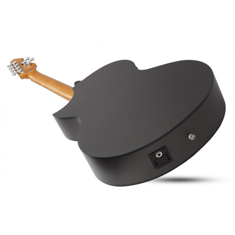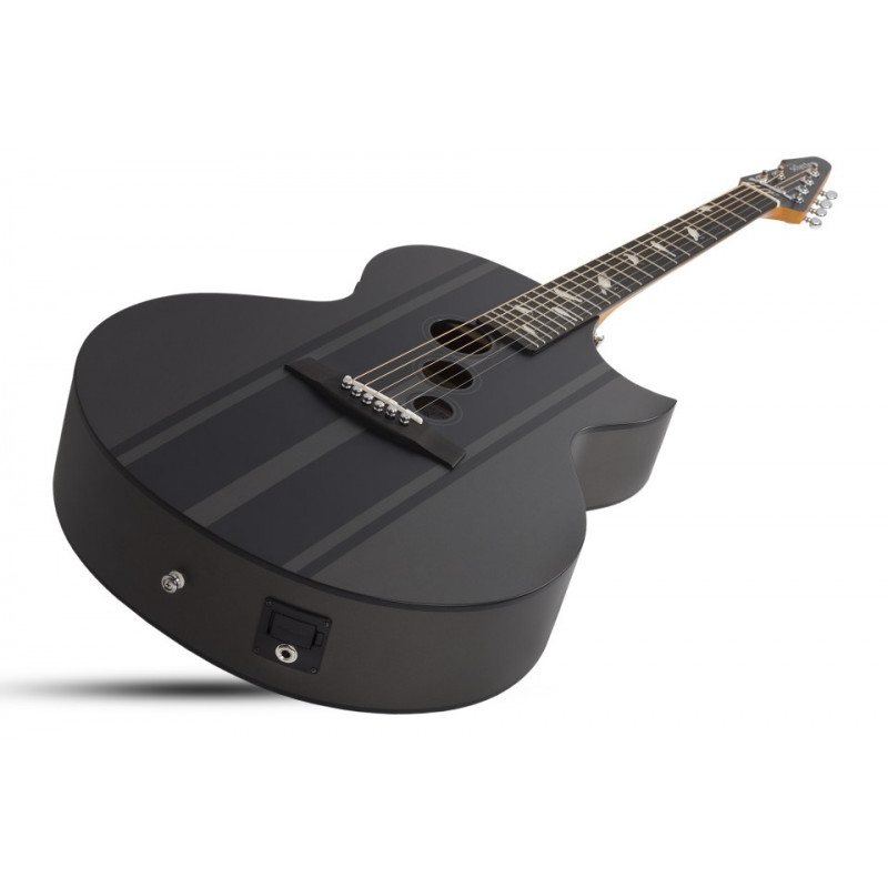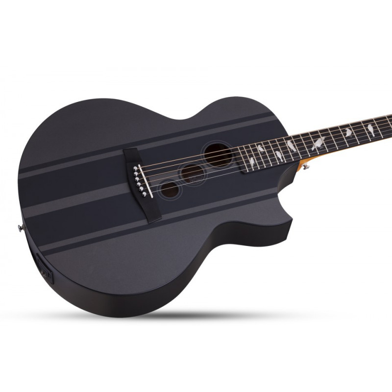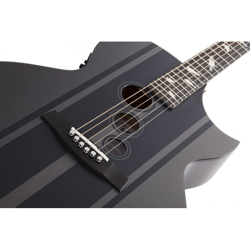 SCHECTER DJ ASHBA ACOUSTIC SCG - електроакустична гітара, стерв'ятник кріплення: DoveTail Set-Neck, матеріал корпусу: червоне дерево, матеріал верхньої палуби: ялина ціла, стерв'ятниковий матеріал: клен, облицювання стерв'ятника: чорне дерево, оксамитова: чорний одношаровий, лад: "птахи на дротах", мензура: 25,5" (648 мм), лади: 22 Вузький радіус X-Jumbo Стерв'ятник: 16" (406 мм), форма грифа: Тонкий 'C', поршні: кістка, ширина хліба: 1,693" (43 мм), якір: подвійний, регульований, з 4 мм якірним болтом, звуковий годинник: Fishman Sonicore Piezo, Електроніка: Fishman Isys' Preamp (Об'єм / Бортовий тюнер / бас / требл / фазовий перемикач), Фітинги Колір: Чорний, Ставки: Grover Rotomatic 18:1, Колір: Вуглецевий сірий (CBG).