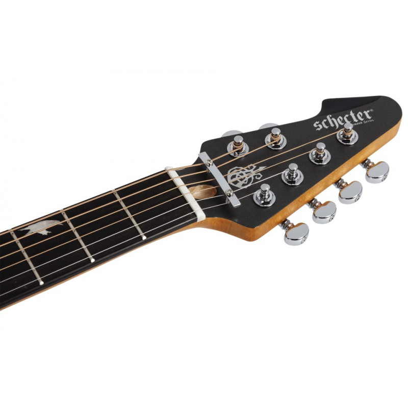 SCHECTER DJ ASHBA ACOUSTIC SCG - електроакустична гітара, стерв'ятникове кріплення: DoveTail Set-Neck, матеріал тіла: червоне дерево, матеріал верхньої палуби: ялина ціла, стерв'ятник матеріал: укус, підкладка для шиї: чорне дерево, оцтовка: чорна одношарова, fret позначки: "птахи на дротах", menzura: 25.5" (648 мм), лади: 22 Вузький X-Jumbo, радіус грифа: 16" (406 мм), форма грифа: Тонкий 'C', пористий: кістка, пора ширина: 1.693" (43 мм), ананер регульований, з анкерним болтом 4 мм.