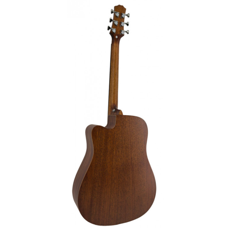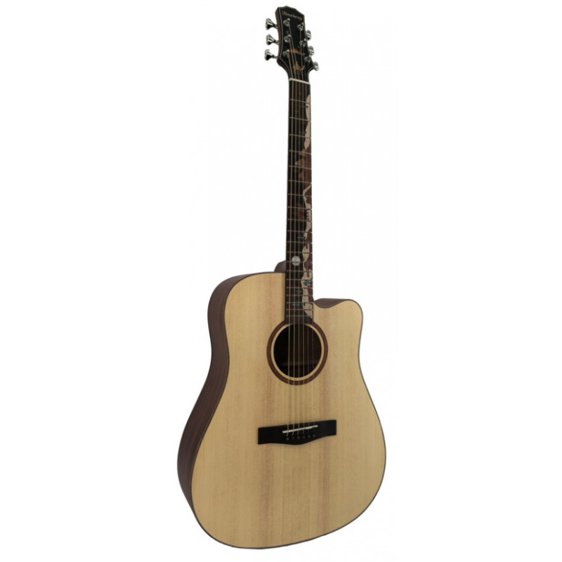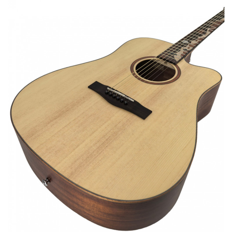 Корпус виготовлений за класичною технологією із застосуванням якісних матеріалів. Верхня дека виконана з комбінації масиву ялини та червоного дерева, що забезпечує ідеальний баланс між яскравістю високих частот та теплотою середніх тонів. Задня дека та боковини з ламінованого червоного дерева додають звуку глибину та насиченість, створюючи потужний резонанс. Накладка грифа з палісандра гарантує довговічність та комфорт при грі, а глянсове покриття захищає деревину та підкреслює красу текстури.
